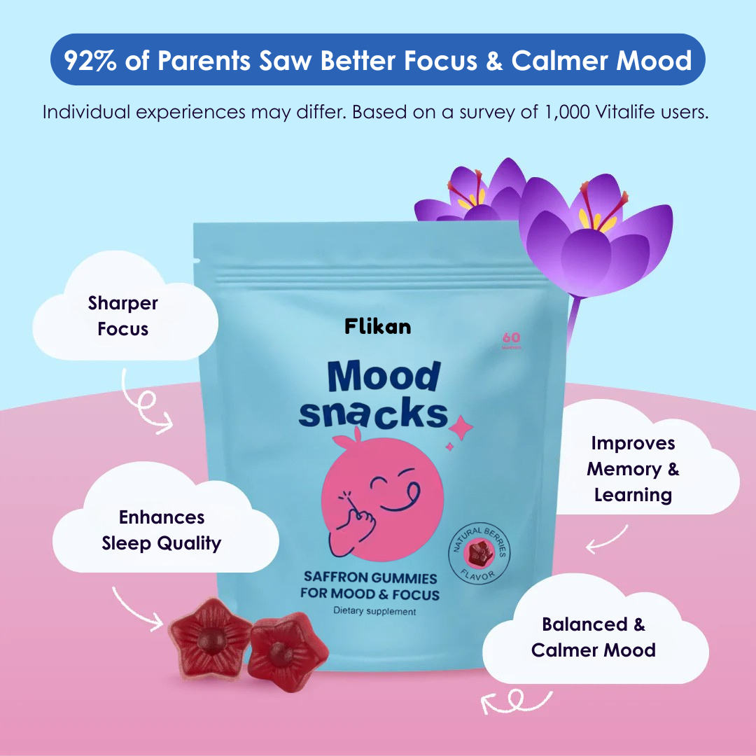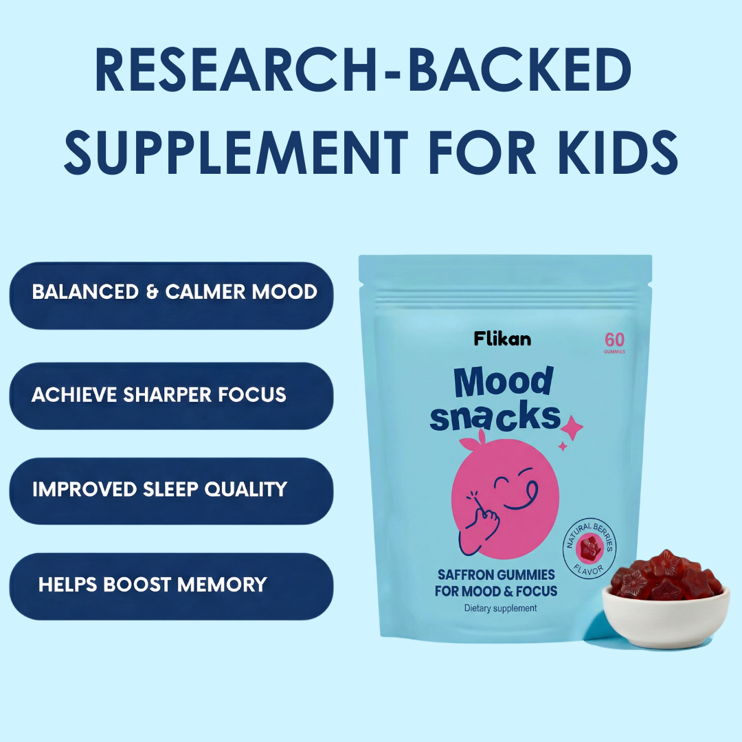 Our saffron gummies are designed to restore that balance naturally. Made with clinically studied saffron extract, they support the brain's ability to regulate mood, reduce stress hormones, and improve emotional control. It works at the root—calming the nervous system and helping your child's developing brain find its natural rhythm.